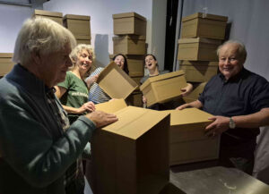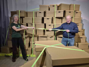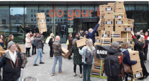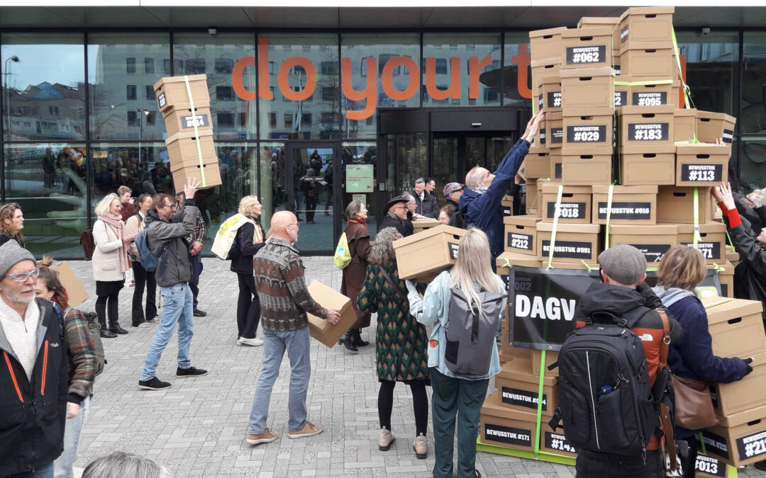 Dat vroeg om heel veel dozen die gevouwen moesten worden, om heel veel dubbelzijdig tape om ze zonder calamiteitenrisico te stapelen, om heel veel spanband (opvallende gifgroene kleur) en om behoorlijk wat ruimte. En dat vraagt ook om heel veel werk en of Milieudefensie kon helpen.