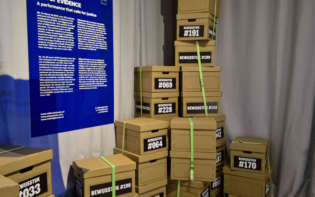 Op 28 maart 2025 heeft Milieudefensie demonstratief een dagvaarding bij ING in Amsterdam neergelegd vanwege het financieren van klimaatschade. Ter deze gelegenheid was een fraaie constructie opgetuigd, waarmee men processiegewijze door de Bijlmer naar het hoofdkantoor van ING trok. Daar aangekomen bleef de bedrijfsleiding onzichtbaar. Zie https://eindhoven.milieudefensie.nl/ing/ . Hieronder een plaatje.